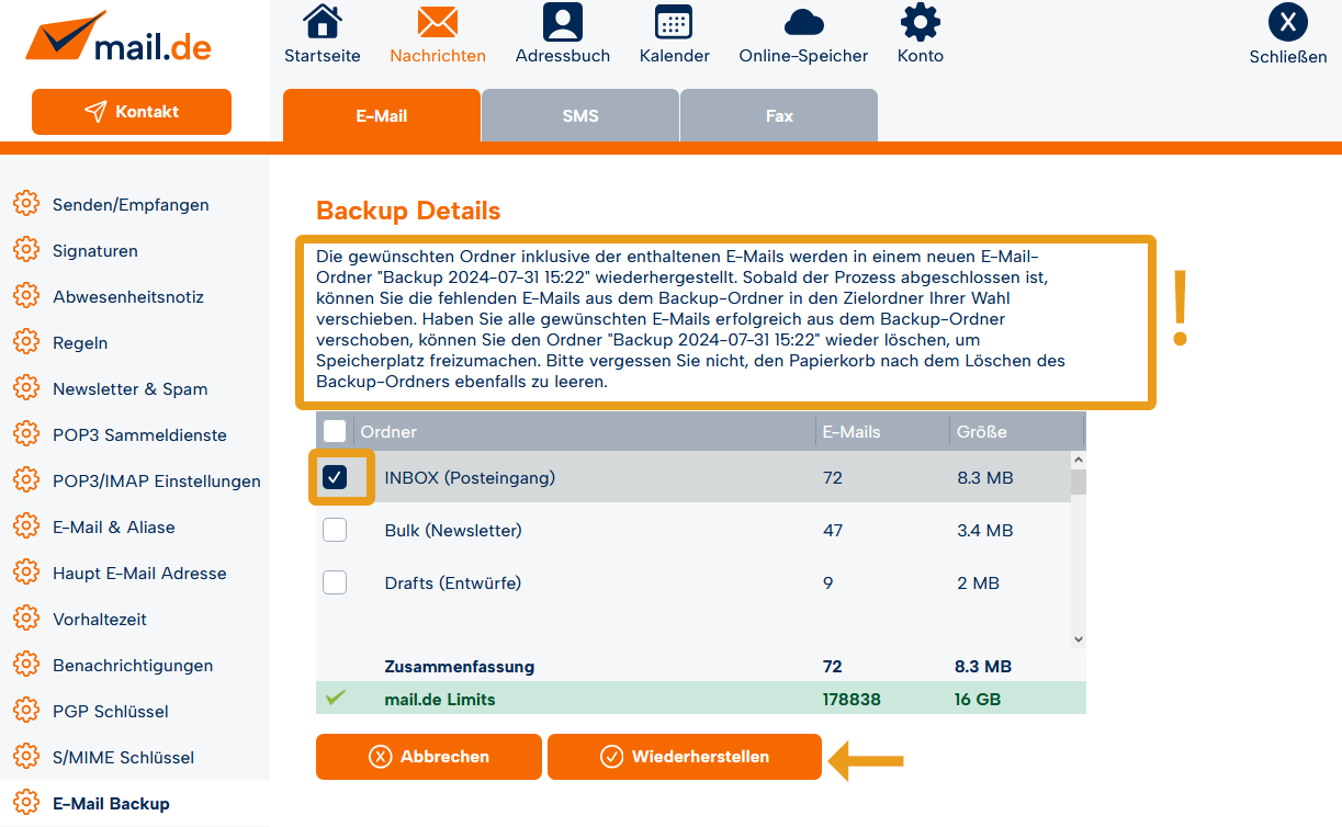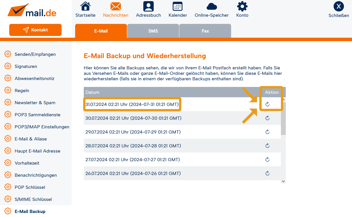 Aus Sicherheitsgründen sichert mail.de einmal täglich die E-Mail-Ordner. Als mail.de-Kunde können Sie nun auf