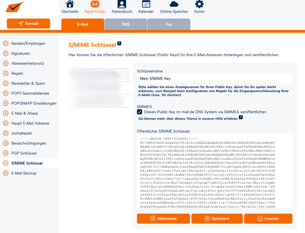 Ein weiterer Vorteil besteht darin, dass Sie als mail.de Kunde jederzeit Ihre(n) Public Key(s) löschen oder durch neue ersetzen können.